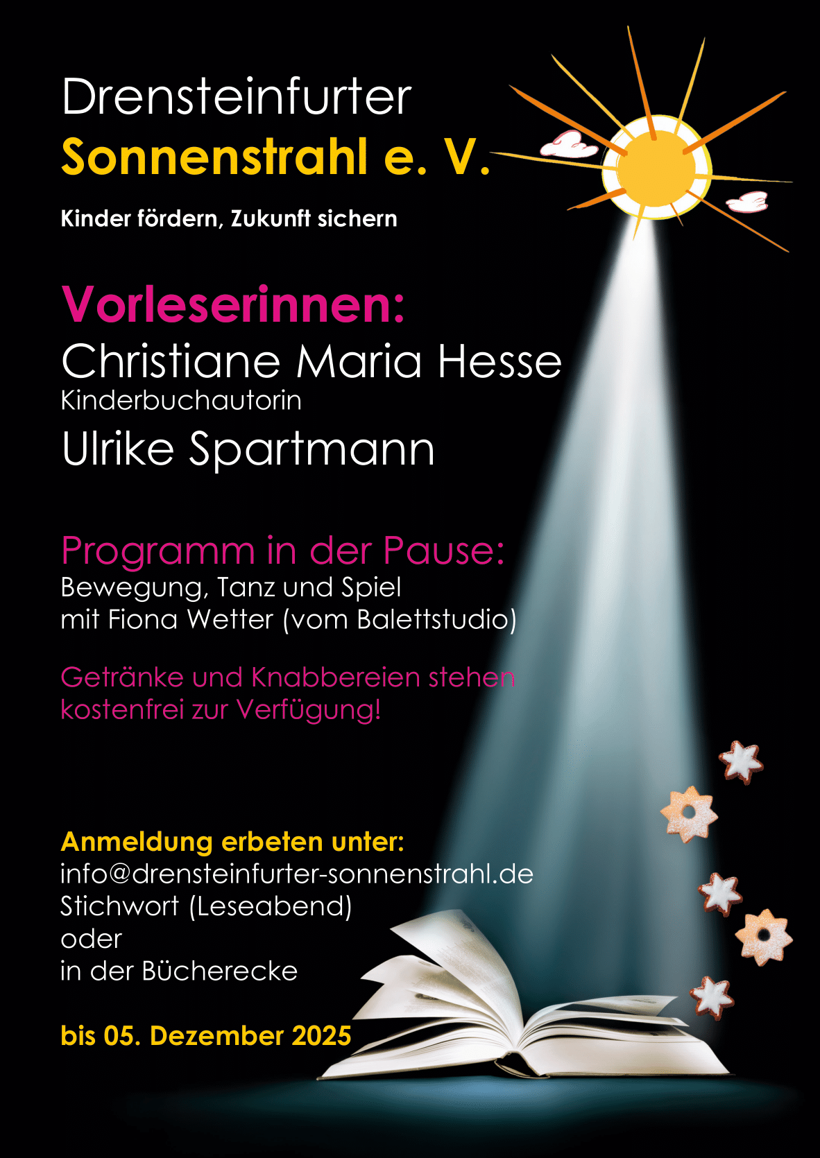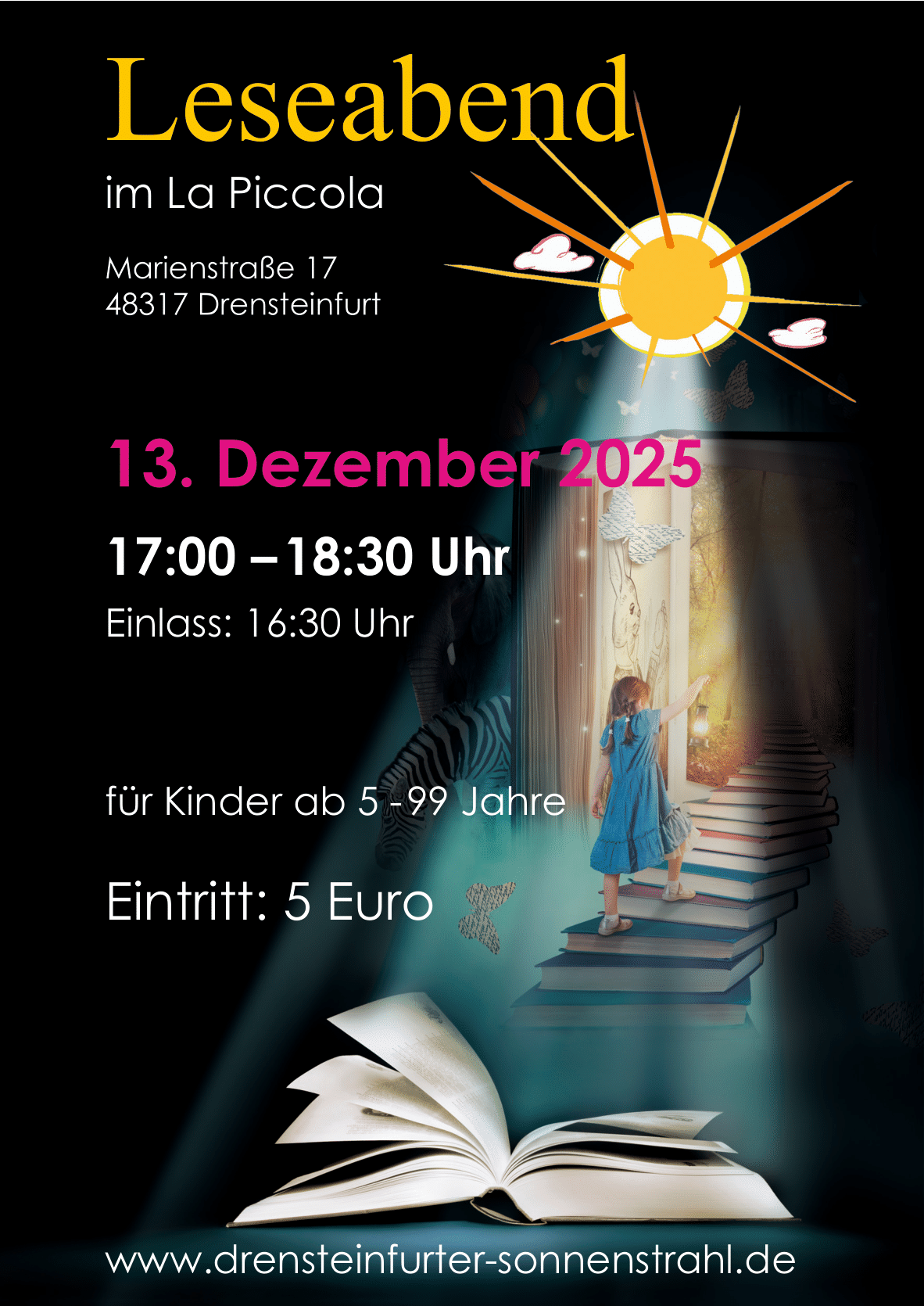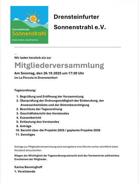 Alle Mitglieder des Vereins "Drensteinfurter Sonnenstrahl e.V" werden hiermit zur offiziellen Mitgliederversammlung am 26.10.2025 im La Piccola Drensteinfurt eingeladen.